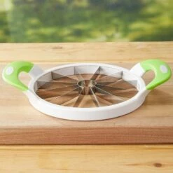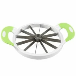 Slice fruit quickly and easily with this 12″ Melon Slicer. It cuts melon into 12 pieces and can also be used on other fruits. Its rubber handles give you a better grip for easier, safer slicing. Made from:Polypropylene and steelMeasurements:12″ dia. x 2-1/2″H without the handlesCare:Dishwasher safe