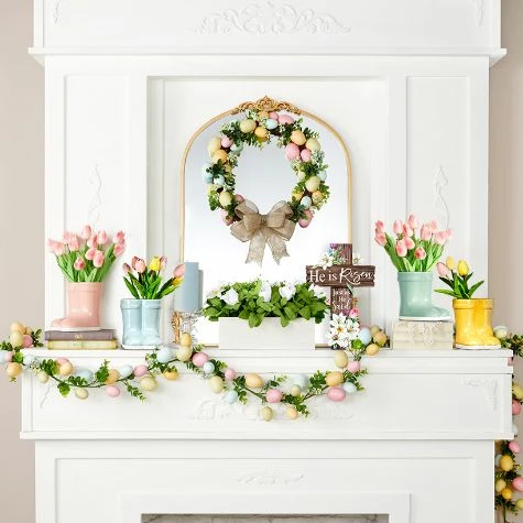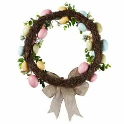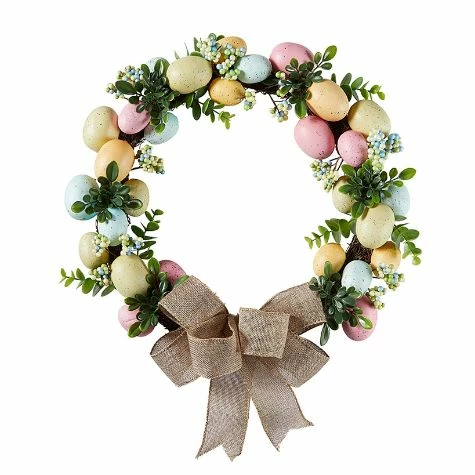 Greet the spring season with this 16″ Egg Wreath with Burlap Bow on a door or wall of your home. It features pastel colored eggs in blue, yellow, pink and green nestled in bright green eucalyptus. It’s finished with a burlap bow. For use indoors or in a covered spot outdoors. Made from: Polyfoam, plastic and natural materialsMeasurements:16″ dia. x 3-1/2″D