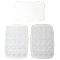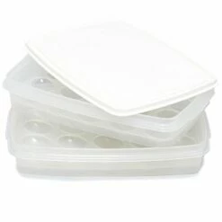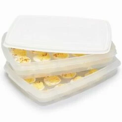 Store and transport up to 40 eggs in this 2-Layer Egg Keeper. It has 2 transparent trays that stack on top of each other and a white, snap-on lid for keeping the eggs fresh. Made from: PolypropyleneMeasurements: 13″W x 9″D x 3-1/2″HNotes: Microwave safe