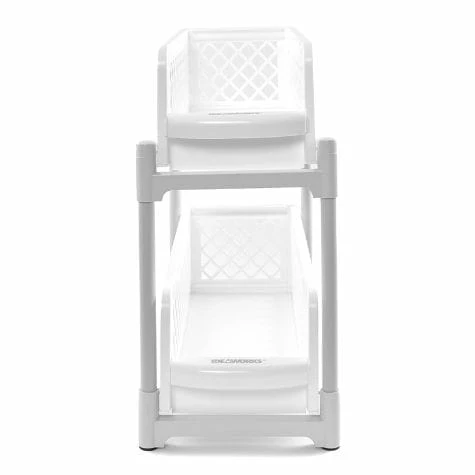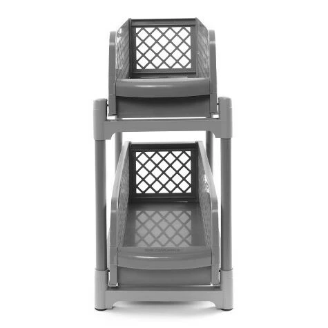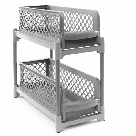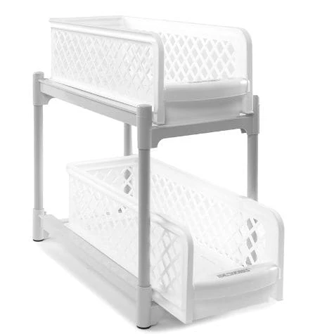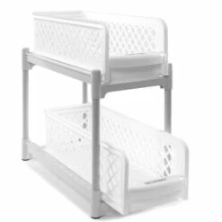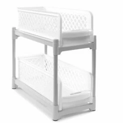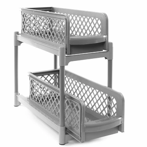 Organize the contents of an under-the-sink cabinet with these 2-Tier Sliding Cabinet Baskets. The baskets feature lips at the front to keep items from falling out. Perforated sides allow you to see the contents. Made from:Polypropylene and plasticMeasurements:6″ baskets, 7-1/4″W x 15″D x 14-1/4″H9″ baskets, 10-1/2″W x 15-1/4″D x 15″HNotes:Assembly required