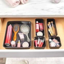Clean up your drawers and give everything its place with this 5-Pc. Drawer Organizer Set. It includes 3 sizes of organizers to hold a variety of items. The set nests for compact storage when not in use. Made from: PolypropyleneSet includes:- Large, 11″W x 14″D x 2-1/2″H- 2 Medium, 4″W x 10″D x 2-1/2″H, each- 2 Small, 4″W x 4″D x 2-1/2″H, each