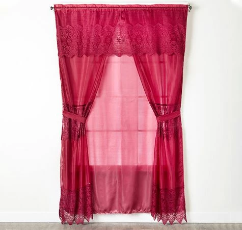 Add some privacy to a room with this semi-sheer 6-Pc. Macrame Window Curtain Set. The valance has macrame detailing across the bottom, and the panels have macrame detailing at the center and the bottom. Rod pockets make hanging easy. Made from: PolyesterMeasurements: 63″ Set, 54″W x 63″L84″ Set, 54″W x 84″LSet includes:- Valance- 2 Panels- Sheer back- 2 Tie-backsCare: Machine careNotes: Imported