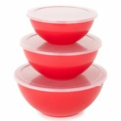 Mix, serve and store using this 6-Pc. Red Covered Bowl Set. It features 3 different sized bowls with lids that latch onto the top of the bowls. When not in use, the set nests together for compact storage. Made from: PolypropyleneSet includes:- Small, 40 oz., with lid- Medium, 74 oz., with lid- Large, 118 oz., with lid Care: Top rack dishwasher safeNotes: Freezer safe