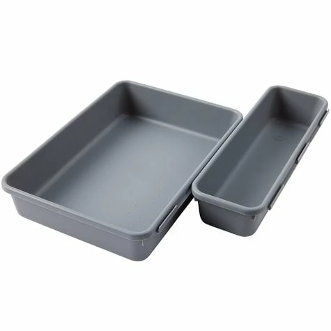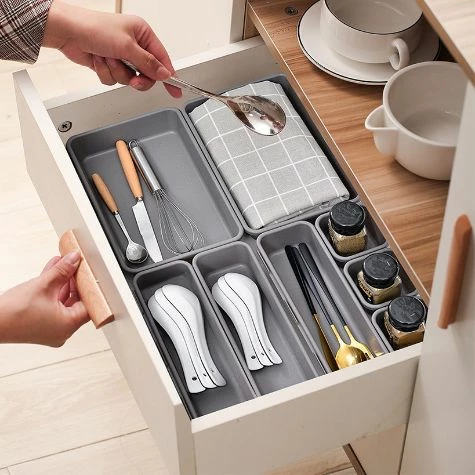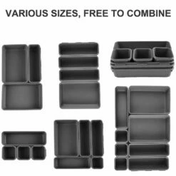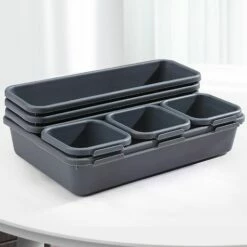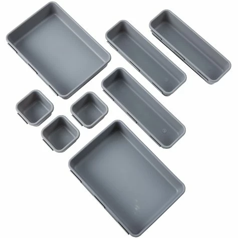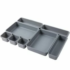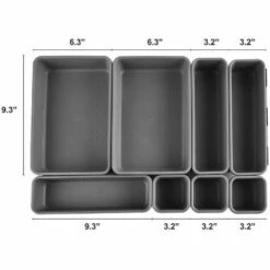 Organize small items, such as makeup, hardware, crafting supplies and more with this 8-Pc. Interlocking Organizer Set. The interlocking feature allows you to configure the set to suit the available space. Made from:PolypropyleneSet includes:- Two bins, 9-1/4″W x 6-3/4″D x 1-3/4″H, each- Three bins, 3″ sq. x 1-3/4″H, each- Three bins, 9-1/4″W x 3″D x 1-3/4″H, each