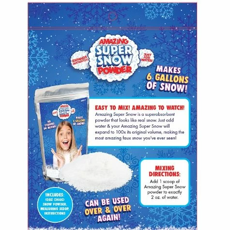 Make your own snow indoors or out with this Amazing Super Snow Powder. Just add water to make up to 6 gallons of snow. It’s great for anyone looking for a STEM sensory exploration toy. Can be used over and over again. Made from: Sodium polycrylate (clay)Measurements: Dry, 12 oz.Makes up to 6 gallons of snowNotes: For ages 4 and up