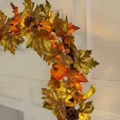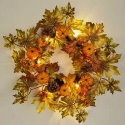 Bring warm fall colors into your home with the Autumn Leaves and Pumpkins Please collection. Set the theme with the Farm Fresh Pumpkins Sign. Add lighted decor with the Garland, Swag or Wreath. Each features greenery with pumpkin accents. Pumpkins Sign 23-3/8″W x 7-3/4″L MDF Garland Requires 2 “AA” batteries 5″ dia. x 60″LPolyester, polyfoam, rattan, PVC and wood Swag Requires 2 “AA” batteries 12″W x 5″D x 22″L Polyester, polyfoam, rattan, PVC and wood Wreath Requires 2 “AA” batteries 18″W x 5″D x 15″H Polyester, polyfoam, rattan, PVC and wood