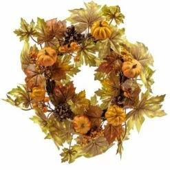 Bring warm fall colors into your home with the Autumn Leaves and Pumpkins Please collection. Set the theme with the Farm Fresh Pumpkins Sign. Add lighted decor with the Garland, Swag or Wreath. Each features greenery with pumpkin accents. Pumpkins Sign 23-3/8″W x 7-3/4″L MDF Garland Requires 2 “AA” batteries 5″ dia. x 60″LPolyester, polyfoam, rattan, PVC and wood Swag Requires 2 “AA” batteries 12″W x 5″D x 22″L Polyester, polyfoam, rattan, PVC and wood Wreath Requires 2 “AA” batteries 18″W x 5″D x 15″H Polyester, polyfoam, rattan, PVC and wood