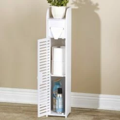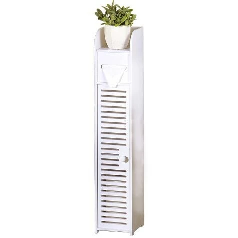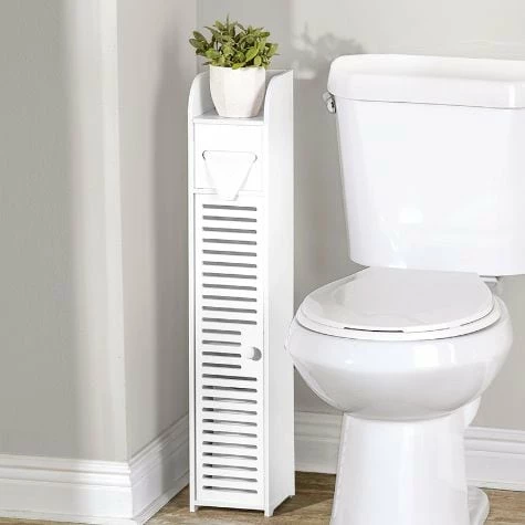 This slim Bathroom Storage Cabinet is perfect for tight spaces. It features a shelf on top, a toilet paper dispenser and a cabinet at the bottom. Inside the cabinet is a shelf for concealed storage of extra rolls of toilet paper, cleaning products and more. New and improved capacity allows storage of regular toilet paper rolls as well as larger or double rolls. Made from: PVCMeasurements: 6″W x 6-3/4″D x 31-1/2″HNotes: Assembly required; assembly hardware included