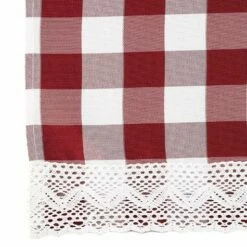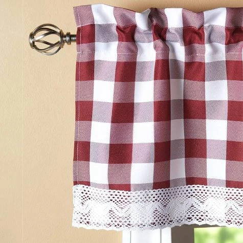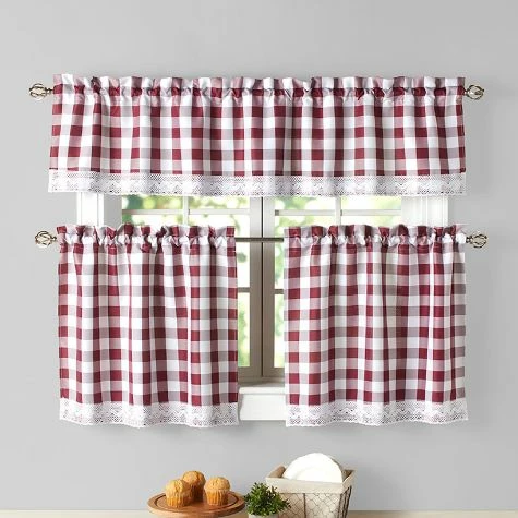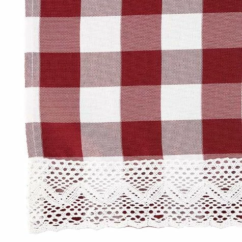 Add a farmhouse touch to your home decor with this Buffalo Check Tier Pair and Valance Set. It features an all-over buffalo check pattern. All pieces have a rod pocket at the top and lace detailing at the bottom. 24″ set includes:- Valance, 58″W x 14″L- 2 Tiers, 29″W x 24″L, each; 58″W, overallPolyesterMachine careImported36″ set includes:- Valance, 58″W x 14″- 2 Tiers, 29″W x 36″L, each; 58″W, overallPolyesterMachine careImported