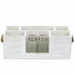 Add a farmhouse accent to your table with this Buffet Caddy. It features 6 compartments that are ideal for holding spoons, forks, knives, straws, napkins, condiments and more. Includes salt and pepper shakers. Has two handles for easy transport. Great for family gathering and parties, or it makes a great gift. Made from:MDF and glassMeasurements:13″W x 4-1/2″D x 4-1/2″H, overallShakers, 1-5/8″ sq. x 3-7/8″H, each