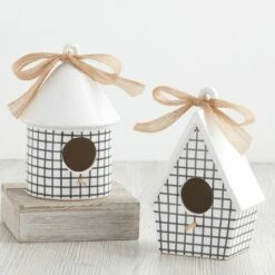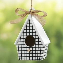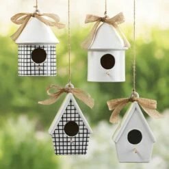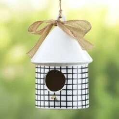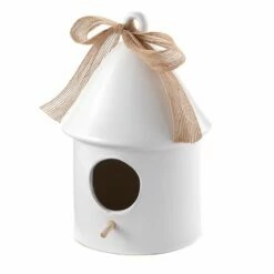 Accent your home decor with this Ceramic Birdhouse. It comes with a hemp bow tied at the top. Can sit on a tabletop or other flat surface or hang from the loop on top. Made from: StonewareMeasurements:Round, 5″ dia. x 7-5/8″HTraditional, 5″W x 3-1/4″D x 8″H