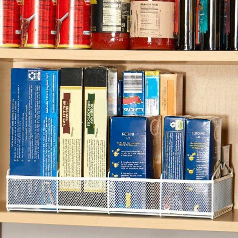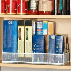 No more digging for the kind of chips you want! Keep them neat and orderly in this Chip Bag Organizer. It holds 4 large bags of chips or several small ones. This powder-coated metal caddy is strong and makes the ideal storage solution for kitchens and pantries. It can also hold drinks, pasta, soups, canned goods, bottles and many other items. Made from: MetalMeasurements: 16-1/2″W x 9-1/4″D x 4″H, overallEach section, 3-7/8″W x 9-1/8″D x 3-1/4″ to 3-5/8″H