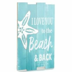 Bring the feel of the beach into your home with this Coastal Home Decor Collection. The Wall Sign reads “I love you to the beach and back” and features a metal starfish. Each in the Set of 3 Metal Wall Hangings is shaped like a starfish. The Sand Dollar Table Lamp plugs into the wall and requires a 40-Watt maximum bulb. Wall Sign10-1/2″W x 16-1/2″LMDFSet of 3 Metal Wall Hangings6-3/8″ x 6-5/8″, eachMetalSand Dollar Table Lamp8″ dia. x 18-1/2″HCold cast ceramic and linen