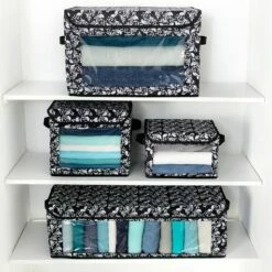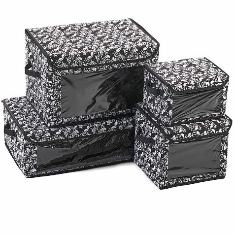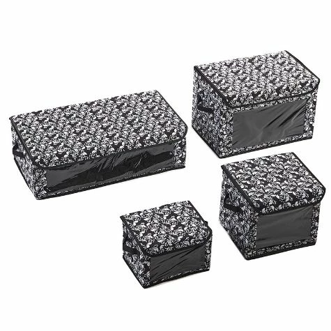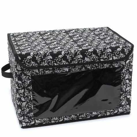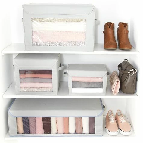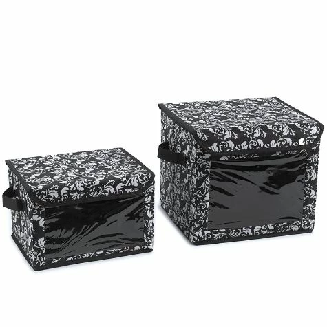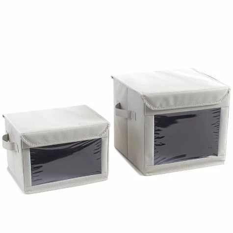 These Collapsible Storage Boxes are ideal for holding household items to help organize your closet. Each box has a small window to let you see what’s inside and easily find what you’re looking for. They also have handles and a lid. They can be collapsed and stacked inside each other when not in use. Made from: Polyester, paperboard and PVCMeasurements:Large Box, 17-3/4″W x 11-1/2″D x 12″HXL Wide Box, 25-1/4″W x 13-1/4″D x 8″H2-Pc. Box Set includes: – Small, 10″W x 7-3/4″D x 7″H- Large, 11-1/4″W x 9-3/4″D x 10″H Notes: Assembly required