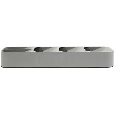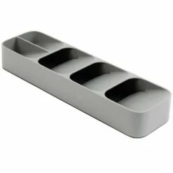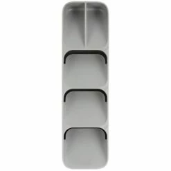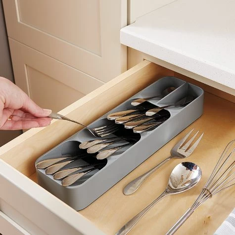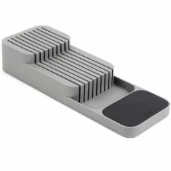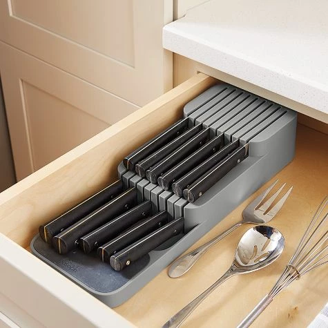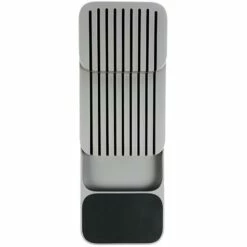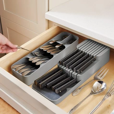 Store more cutlery or knives in less space with a Compact Organizer! Smart cutlery storage angles and layers each compartment so you can stack loads of spoons and forks, plus serving pieces, peelers and more. Items can be placed either head or handle first. Has icons for easy identification. Fits drawers 3-1/4″H and above. Compact knife organizer safely stores large knives on the lower level and small knives on top. Holds up to 9 knives with blades up to 6″L. Nonslip feet. Made from: PolypropyleneMeasurements: Cutlery, 4-3/8″W x 15-1/2″D x 2-1/8″HKnife, 5-1/2″W x 15-1/2″D x 2-1/8″H
