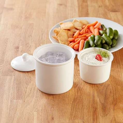 This Cool or Warm Dip Server with Lid is perfect for entertaining. For cool dips, simply put ice in the bottom vessel and for hot dips, add a small amount of hot water. Made from: StonewareMeasurements: 4-3/4″ dia. x 5-3/8″HNotes: Dishwasher safe