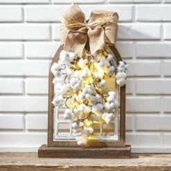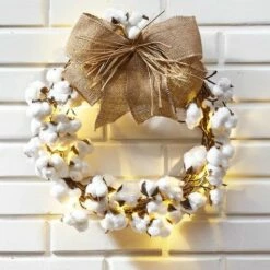 Accent your home for the holidays with Country Cotton Boll Decor. Each item features a burlap bow and looks great in your entryway, on your mantel or anywhere indoors. Wreath16″ dia.Cotton, plastic, rattan and burlapSnowman Wreath8-1/2″W x 16-1/2″LCotton, plastic, rattan and burlapSwag10″W x 20″LCotton, plastic, metal and burlapGarland 70″L Cotton, plastic, metal and burlap