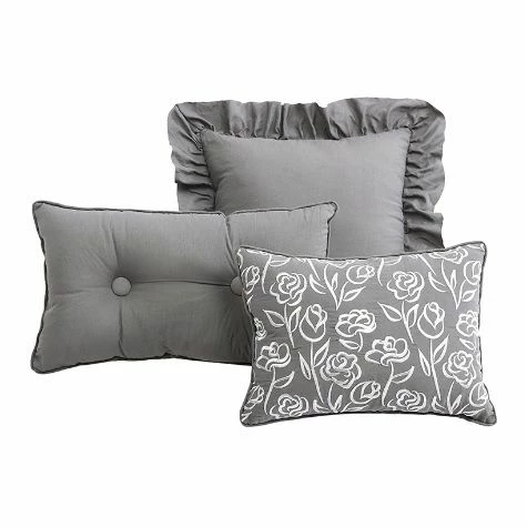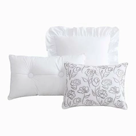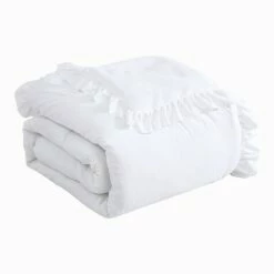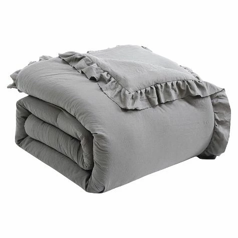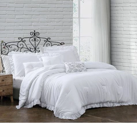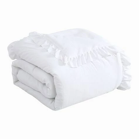 Add a touch of casual elegance to your bedroom with the Davina Enzyme Wash Ruffled Comforter Set. This cozy bedding features a solid, enzyme wash for extra softness, chic ruffled edges and three matching decorative pillows. The comforters feature ruffles on 3 sides, while the shams have ruffles on all 4 sides. King set comes with king-size shams. Twin set includes:- Comforter, 66″W x 90″L- Sham- 3 Decorative pillows:– 16″ sq. with ruffled edges– 20″W x 12″L Pintucked– 16″W x 12″L Floral embroideredPolyester with polyfillMachine careImportedTo achieve a more luxurious look, check measurements and buy up a sizeFull/Queen set includes:- Comforter, 90″ sq.- 2 Shams- 3 Decorative pillows:– 16″ sq. with ruffled edges– 20″W x 12″L Pintucked– 16″W x 12″L Floral embroideredPolyester with polyfillMachine careImportedTo achieve a more luxurious look, check measurements and buy up a sizeKing set includes:- Comforter, 104″W x 90″L- 2 Shams- 3 Decorative pillows:– 16″ sq. with ruffled edges– 20″W x 12″L Pintucked– 16″W x 12″L Floral embroideredPolyester with polyfillMachine careImported