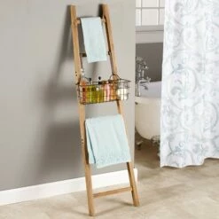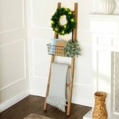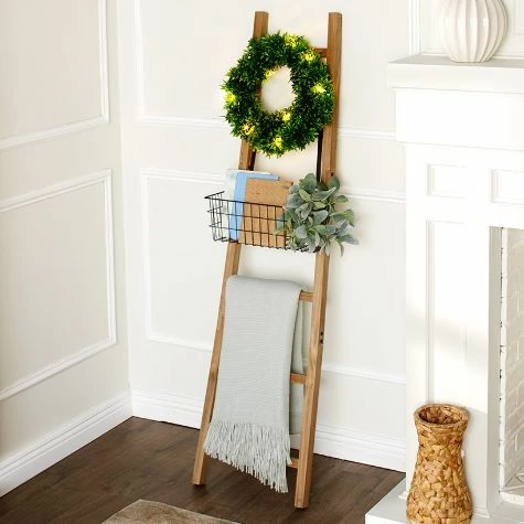 Accent your country-inspired home with this Decorative Leaning Ladder Collection. Fill the Metal Basket with faux flowers, toiletries and more. The Ladder leans against a wall and holds decor items or throws. Ladder15-1/4″W x 2″D x 60″HWoodAssembly required; assembly hardware includedMetal Basket15-3/4″W x 5-1/4″D x 5″HMetal