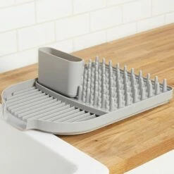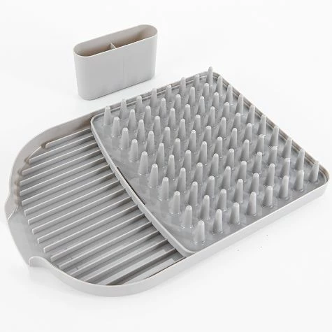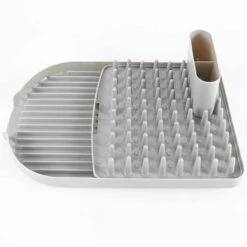 Save counter space and keep your sink area neat with this divided Dish Drying Rack. It has 3 detachable sections to hold various dishes as well as a holder for flatware and other kitchen tools. Sturdy and firm to keep dishes in place. Made from:PolypropyleneMeasurements:12-1/2″W x 17-1/2″D x 4″H, overall