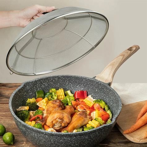 Tired of cooking food and ending up with a mess? Use this Dome Splatter Screen to keep oils and food from splashing out of the pan while cooking. Equipped with a handle on top for easy use and a smooth surface for hassle-free cleaning. Made from:Stainless steelMeasurements:13″ dia. x 8″H