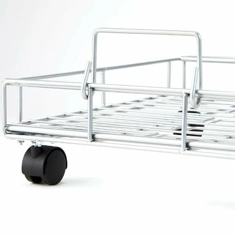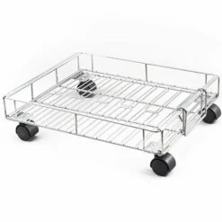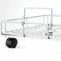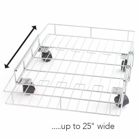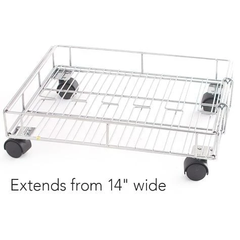 Maximize storage with this Expandable Rolling Metal Basket. It is short enough for tight spaces and can be enlarged by extending the sides. The 4 wheels make it easy to roll around. Use the basket to hold pantry items such as potatoes, baking supplies, paper goods and more. Made from:MetalMeasurements:14″W x 17″D x 5″HExtended, 25″WNotes:Assembly required; assembly hardware included