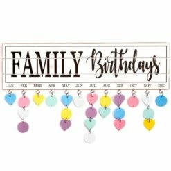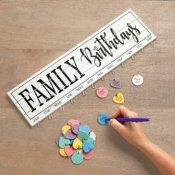 Never again forget a family member’s birthday with this Family Birthday Plaque on a wall of your home. It has a white distressed finish with each month listed along the bottom with a hook beneath it. Write each person’s name on a tag and hang it under the month of their birthday as a reminder. Comes with 24 colorful tags in shapes of hearts and circles. Made from: MDF and plywoodMeasurements: 18″W x 5″L24 tags, 1-1/4″ dia., eachNotes: Ready to hang