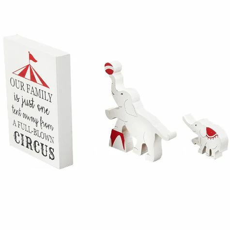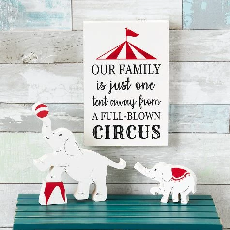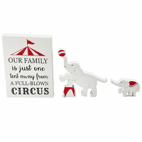 Accent a shelf, mantel or desk with this 3-Pc. Family Circus Set. The plaque is engraved with the saying, “Our family is just one tent away from a full-blown circus.” It comes with a mama and a baby elephant. The pieces are designed to stand by themselves. Made from: MDFSet includes:- Plaque, 6-3/4″W x 9-7/8″L- Mama elephant, 7-1/8″W x 1″D x 8″H- Baby elephant, 5-1/8″W x 1″D x 3″H