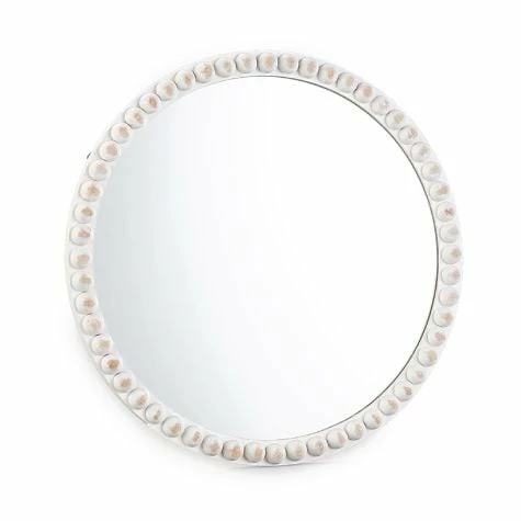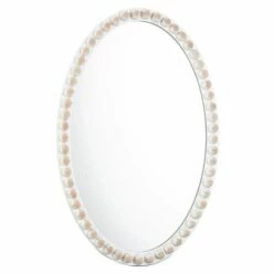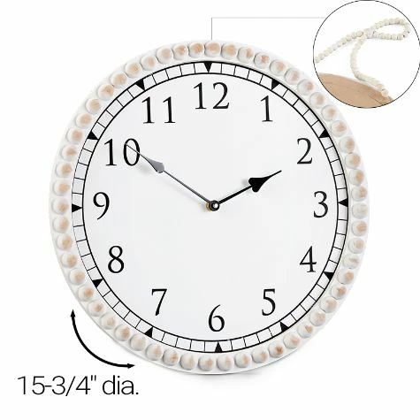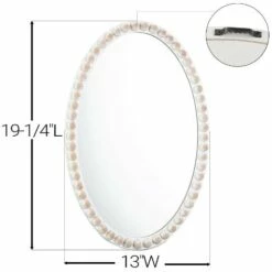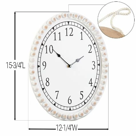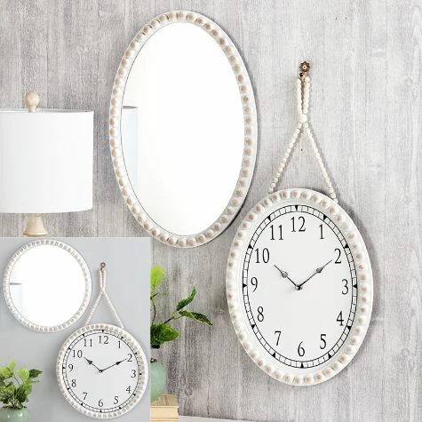 Accent a wall with this Farmhouse Beaded Clock or Mirror. The Clock is battery operated for display anywhere in your home. It arrives ready to hang with a matching beaded hanger. The Mirror adds light to a room, as well as the illusion of more space. ClockOval, 12-1/4″W x 15-3/4″LRound, 15-3/4″ dia.MDF and woodMirrorOval, 13″W x 19-1/4″LRound, 15-3/4″ dia.  MDF, glass and woodNotes:Clock requires 1 “AA” battery