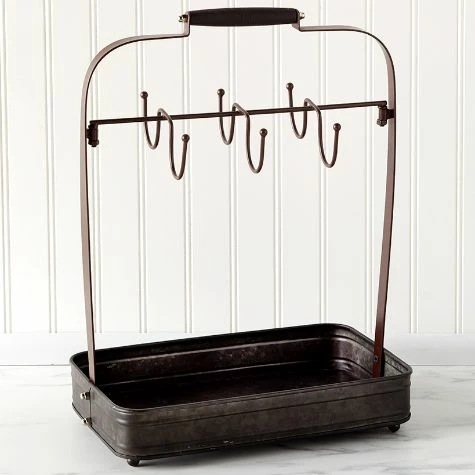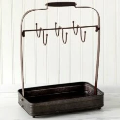 Farmhouse Coffee Mug Rack with Tray has galvanized details and stores your mugs and teacups by their handles. Hang your mug on any of the 6 hooks, 3 on each side. The rack’s base can be used to store additional mugs, cream and sugar containers or decor. Made from:MetalMeasurements:12-1/2″W x 8″D x 18″HNotes:Some assembly required; assembly hardware included