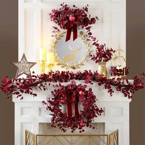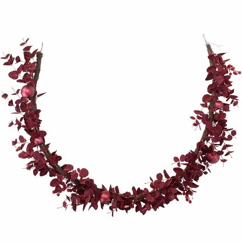Take your holiday decorating to the next level with this Festive Eucalyptus Garland. A blend of nature and glamour, it features burgundy leaves, gold berries and dark burgundy ball ornaments. Has a loop at one end to hang it from. Made from: Polyester, polyethylene, rattan and metalMeasurements: 68″L