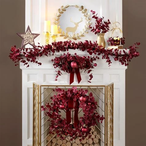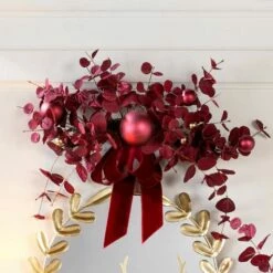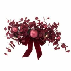 Give your home decor a bit of glamour with this Festive Eucalyptus Swag. It features burgundy leaves, gold berries and dark burgundy ball ornaments. Perfect for hanging above a doorway or window, or for adding interest to empty wall space! Made from: Polyester, polyethylene, rattan and metalMeasurements: 24″W x 4″D x 7″H