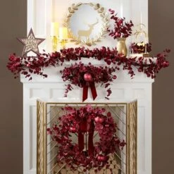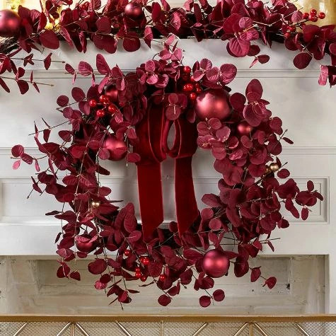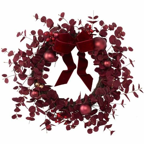Decorate for Christmas by hanging this Festive Eucalyptus Wreath on your front door or a wall inside your home. It features burgundy leaves, shiny burgundy and gold berries, dark burgundy ball ornaments and a burgundy velvet bow at the top. Made from: Polyester, polyethylene, rattan and metalMeasurements: 18″ dia.