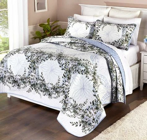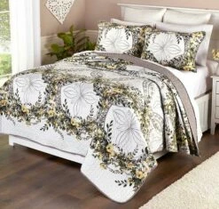Give your bedroom a new look with this Floral Wedding Ring Quilt Set. The elegant pattern features wedding rings that are intertwined with florals. Yellow reverses to solid gray, while Blue reverses to solid light blue. The King set comes with king-size shams. Twin set includes:- Quilt, 66″W x 86″L- Sham Polyester with polyfillMachine careImportedTo achieve a more luxurious look, check measurements and buy up a size Full/Queen set includes:- Quilt, 90″ sq.- 2 ShamsPolyester with polyfillMachine careImportedTo achieve a more luxurious look, check measurements and buy up a size King set includes:- Quilt, 104″W x 92″L- 2 ShamsPolyester with polyfillMachine careImported