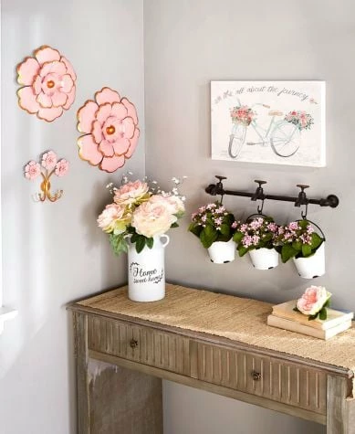 Find unique home decor accents in our Flower Market Collection. The Enamel Bucket Wall Hanging makes a great statement piece. It features 3 hanging buckets to fill with your own faux greenery and 3 faucets which seem to be watering the faux plants. Flower Wall Hooks have 3 flowers and 3 hooks. Metal Wall Flowers are available in Small and Large. Each pink flower is accented with gold at the edge of the petals and in the flower’s center. The Ceramic Vase reads, “Home Sweet Home.” Fill it with your own fresh or faux flowers. About the Journey Wall Hanging features a flower-filled bicycle. Enamel Bucket Wall Hanging21-3/4″W x 5″D x 12-1/2″HMetalAssembly required; assembly hardware includedFlower Wall Hooks7-1/2″W x 2-1/4″D x 7-1/8″HMetalMetal Wall FlowersSmall, 10-3/4″ dia. x 1-3/4″HLarge, 13-1/2″ dia. x 1-3/4″HReady to hangMetalCeramic Vase 6-1/2″W x 5-1/4″D x 9-3/4″HAbout the Journey Wall Hanging18″W x 12″L MDFArrives ready to hang