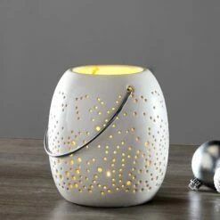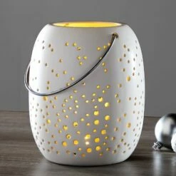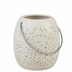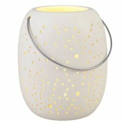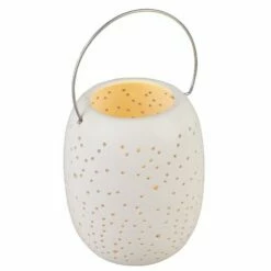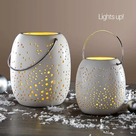 Decorate your mantel, shelf or entryway table with this Frosted Snowflake Lantern. It features tiny perforations that let the LED light shine through. Requires batteries. Made from: Dolomite and polypropyleneMeasurements:6″ Lantern, 5-1/2″ dia. x 6-3/8″H8″ Lantern, 6-3/4″ dia. x 8-5/8″HNotes:Requires 2 “AA” batteries