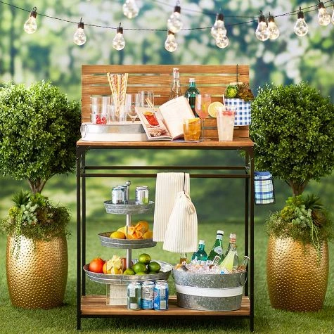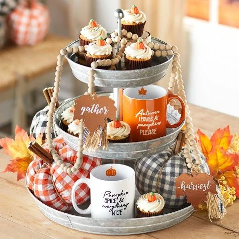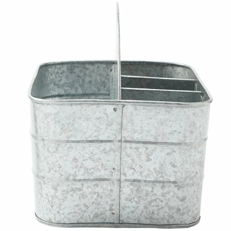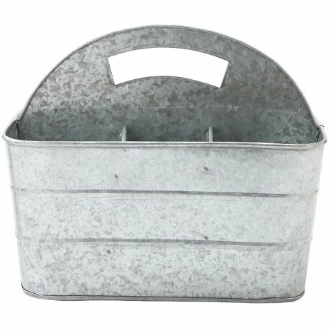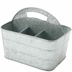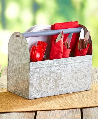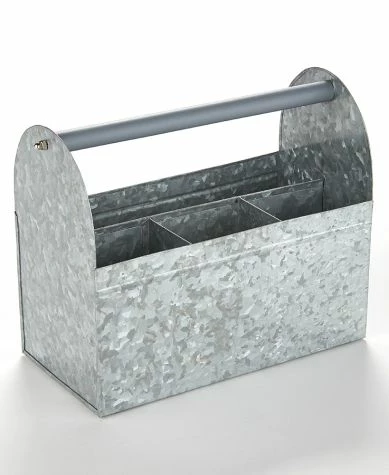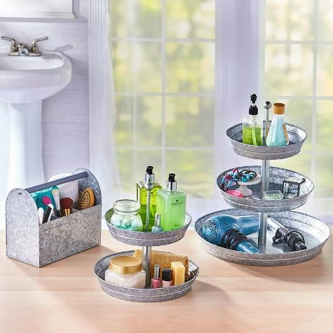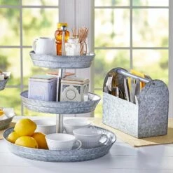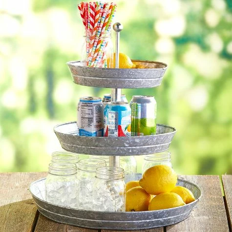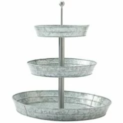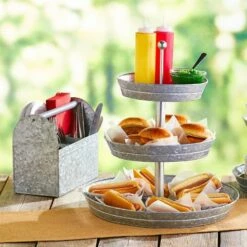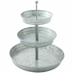 Set out appetizers, desserts and more on this Galvanized Serving Tray. The 2-Tier Serving Tray and 3-Tier Serving Tray have graduated levels to create an organized, appealing display. The Caddy has a large section for plates or napkins, 3 small sections for utensils and a wood handle for carrying. Also makes useful storage for your craft supplies. 2-Tier Serving Tray12″ dia. x 12″H, overall Bottom tray, 12″ dia. x 2″HTop tray, 9-3/4″ dia. x 2″HMetal3-Tier Serving Tray16-3/4″ dia. x 18″H, overallBottom tray, 16-3/4″ dia. x 2″HMiddle tray, 12″ dia. x 2″HTop tray, 9-3/4″ dia. x 2″HMetalCaddy11-5/8″W x 5-1/2″D x 9-1/8″HMetal and wood