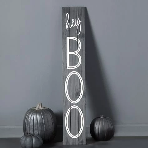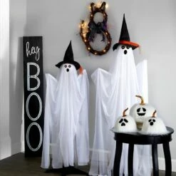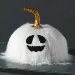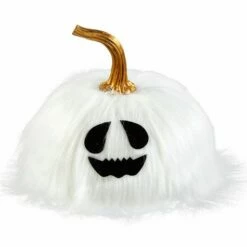 Create a spooky display inside your home using these Ghostly White Halloween Accents. Eye-catching table decor, the Furry Ghost Pumpkins are available as one large pumpkin or two small ones. Complete the display with the Leaning Hey Boo Sign against a wall or piece of heavy furniture. Hang the Lighted Ghostly Haunter off the staircase or at the corner of two walls. Furry Ghost PumpkinsLarge, 9-3/8″ dia. x 8-1/4″HSet of 2 Small, 7″ dia. x 6″H, eachPolyester and woodLeaning Hey Boo Sign7-7/8″W x 47-1/4″LMDF Lighted Ghostly HaunterRequires 3 “AA” batteries40″W x 70″LMesh and polyfoamAssembly required; assembly hardware included
