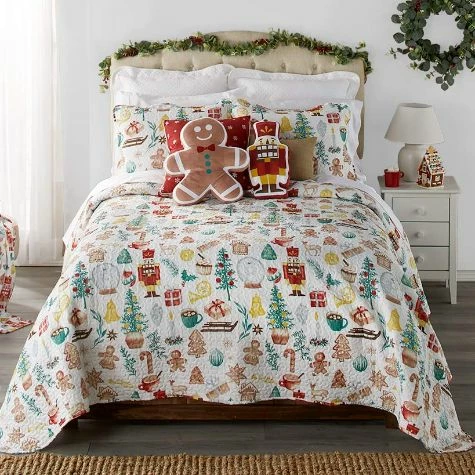 Extend your home’s Christmas decor into the bedroom with this Gingerbread Quilted Bedding Ensemble. It looks cute in a kid’s room, guest room or even the master bedroom. The Sham and Quilt feature an all-over print of Christmas icons such as snowmen, candy canes, nutcrackers and more. Add a coordinating Accent Pillow to complete the look. Sham26″W x 20″LCotton with cotton fillMachine careImportedAccent PillowGingerbread, 15-7/8″W x 18″HNutcracker, 8-7/8″W x 18″HPolyester with polyfillImportedFull/Queen Quilt86″ sq.Cotton with cotton fillMachine careImportedKing Quilt101″W x 86″LCotton with cotton fillMachine careImported