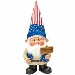 Celebrate the changing seasons with this Gnome with Four Seasonal Outfits. Place him near the front door holding a “Welcome” sign. Changing outfits is easy because his arms detach and reattach with new, improved magnets so they don’t fall off. His hat hooks onto his ears with wire. Made from: Cold cast ceramic and polyesterMeasurements: 6-5/8″W x 4-1/2″D x 9-1/4″HOutfits include:- Santa- Witch- Easter Bunny- Uncle Sam