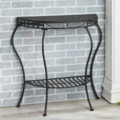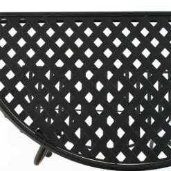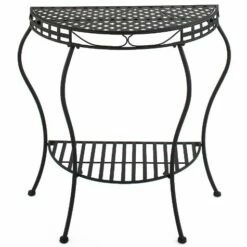 Use this Half-Moon Metal Console Table indoors or out. It features a grid-like tabletop and a shelf near the bottom. It has 4 legs that curve outward. Designed to be placed against a wall or the back of a sofa. Made from: MetalMeasurements: 33-1/2″W x 14″D x 32-1/4″HNotes: Assembly required; assembly hardware included