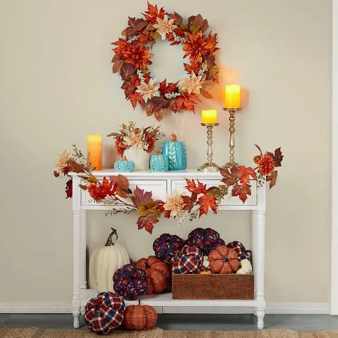 Display this Harvest Blue Gather Collection together or spead the items around your home. They would look stunning on the dining table or entryway table, or perhaps on the fireplace mantel. The ceramic pumpkin vase comes in 3 different sizes/colors. The Set of 3 Blue Ceramic Pumpkins lights up from within. The only piece that’s not for tabletop display is the Gather Wall Hanging. Small Teal Vase5-3/4″ dia. x 6-1/4″HCeramicMedium Cream Vase5-1/4″ dia. x 7-3/4″HCeramicLarge Orange Vase4-3/4″ dia. x 12-1/4″HCeramic Set of 3 Blue Ceramic Pumpkins includes:- 3-1/2″ dia. x 4-3/4″H- 3-3/4″W x 3-1/2″D x 3″H- 3-1/2″W x 3-1/4″D x 4″HEach requires 2 button-cell batteries Gather Wall Hanging24″W x 8″LMDFReady to hangSet of 2 Pumpkin Pillar Candleholders includes:- 3-3/4″ dia. x 8″H- 3-3/4″ dia. x 11-3/4″HCold cast ceramic