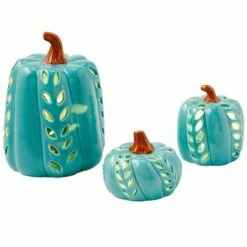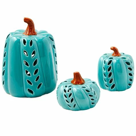 Display this Harvest Blue Gather Collection together or spead the items around your home. They would look stunning on the dining table or entryway table, or perhaps on the fireplace mantel. The ceramic pumpkin vase comes in 3 different sizes/colors. The Set of 3 Blue Ceramic Pumpkins lights up from within. The only piece that’s not for tabletop display is the Gather Wall Hanging. Small Teal Vase5-3/4″ dia. x 6-1/4″HCeramicMedium Cream Vase5-1/4″ dia. x 7-3/4″HCeramicLarge Orange Vase4-3/4″ dia. x 12-1/4″HCeramic Set of 3 Blue Ceramic Pumpkins includes:- 3-1/2″ dia. x 4-3/4″H- 3-3/4″W x 3-1/2″D x 3″H- 3-1/2″W x 3-1/4″D x 4″HEach requires 2 button-cell batteries Gather Wall Hanging24″W x 8″LMDFReady to hangSet of 2 Pumpkin Pillar Candleholders includes:- 3-3/4″ dia. x 8″H- 3-3/4″ dia. x 11-3/4″HCold cast ceramic