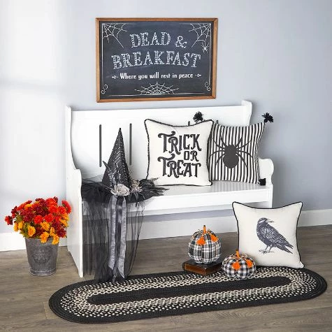 Add spooky accents to your home with this Haunted Farmhouse Decor Collection. Collection includes the Pillow Cover, the Plaid Pumpkin, the Witch’s Hat and the Dead and Breakfast Plaid Wall Sign. Pillow Cover16″ sq.Polyester Machine wash and line dryImported Plaid PumpkinBuffalo, 6″ dia. x 6″HTartan, 6″ dia. x 8″HPolyesterImported Witch’s Hat15″ dia. x 13-3/8″HPolyester ImportedDead and Breakfast Plaid Wall Sign 20″W x 13-1/2″HMDF