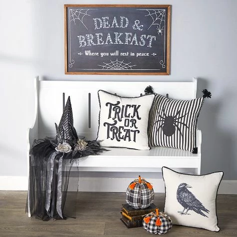 Add spooky accents to your home with this Haunted Farmhouse Decor Collection. Collection includes the Pillow Cover, the Plaid Pumpkin, the Witch’s Hat and the Dead and Breakfast Plaid Wall Sign. Pillow Cover16″ sq.Polyester Machine wash and line dryImported Plaid PumpkinBuffalo, 6″ dia. x 6″HTartan, 6″ dia. x 8″HPolyesterImported Witch’s Hat15″ dia. x 13-3/8″HPolyester ImportedDead and Breakfast Plaid Wall Sign 20″W x 13-1/2″HMDF