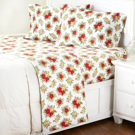 Bring holiday decorating into your bedroom with this Holiday Bed Tite Sheet Set. Available in Poinsettia and Snowman patterns. These silky smooth sheets fit perfectly and stay in place! The unique fabrication allows the fitted sheet to stretch to fit mattresses from 7″ to 20″ deep. The sheets never lose tension and get better with each wash. King set includes king-size pillowcases. Wrinkle resistant and easy care. Made from: PolyesterSet includes:- Flat sheet- Fitted sheet- 2 Pillowcases (1 with Twin)Care: Machine careNotes: Imported