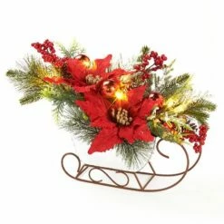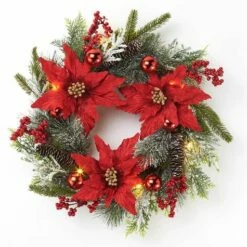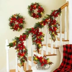 Give your home that traditional holiday look with the poinsettia motif of these Holiday Decorating Essentials. The Centerpiece, Garland, Wreath and Swag light up for an eye-catching effect. The Set of 24 Garland Ties holds the garland on a railing. Centerpiece17″W x 8″D x 12″HPlastic, metal and polyesterRequires 2 “AA” batteriesGarland60″LPlastic and polyesterRequires 2 “AA” batteriesWreath18″ dia.Plastic and polyesterRequires 2 “AA” batteriesSwag10″W x 4″D x 24″HPlastic and polyesterRequires 2 “AA” batteriesSet of 24 Garland Ties2-1/2″W x 15″L, eachPVC