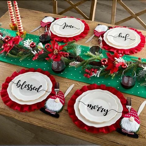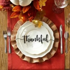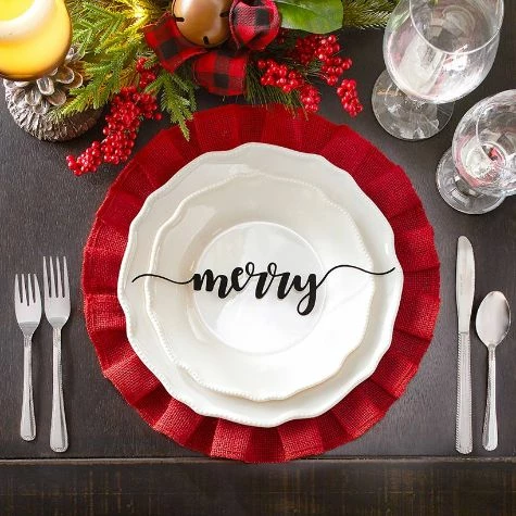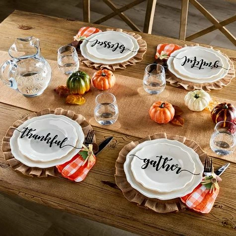 Give your table a festive feel for the Thanksgiving or Christmas season with this Holiday Place Setting Collection. Each plate features a beaded border to add a touch of class. The chargers feature ruffled borders. The sentiments serve as place cards for guests. Harvest Sentiments include thankful, gather, grateful and blessed. Christmas Sentiments include blessed, noel, joy and merry. Set of 4 Chargers13″ dia., eachJuteSet of 4 SentimentsApprox. 10″W x 2-1/2″H, eachMetalSet of 4 Salad Plates8-1/2″ dia., eachMelamineDishwasher safeNot for use in microwaveSet of 4 Dinner Plates10-1/2″ dia., eachMelamineDishwasher safeNot for use in microwave