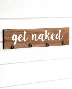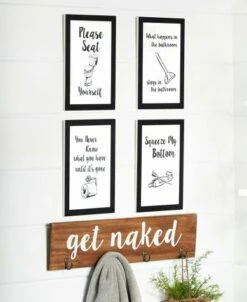 Put a smile on the face of all who use your bathroom with these Humorous Bathroom Accents. Decorate a wall with the Set of 4 Wall Signs, which feature funny sayings with appropriate illustrations. The 2-Pc. Wash Your Hands Set includes a soap pump that reads, “You know what you touched” and a wall hanging that reads,”Wash your hands. No seriously.”  The Get Naked Wall Hooks has 4 hooks for holding robes and towels. The 3-Pc. Countertop Storage set features glass containers with descriptions of the intended contents and metal lids. Set of 4 Wall Signs7-7/8″W x 11-3/4″L, eachMDFReady to hang2-Pc. Wash Your Hands Set includes:- Soap pump, 3″ dia. x 7-1/2″H- Wall hanging, 8″ sq. Glass and MDFGet Naked Wall Hooks23-1/2″W x 2″D x 5-3/4″HMDFReady to hang3-Pc. Countertop Storage set includes:- Brush, 3″ dia. x 5-1/4″H- Tips, 2-1/2″ dia. x 4-1/4″H- Balls, 4-1/4″ dia. x 4-1/2″HGlass with metal lids