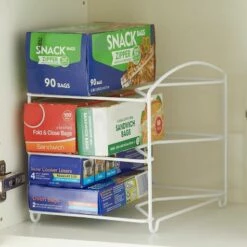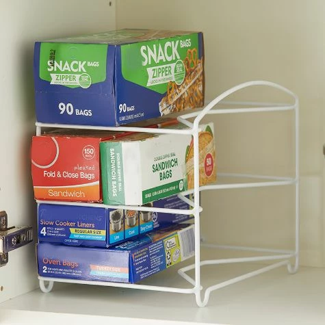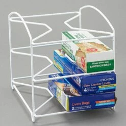 Make the most of your kitchen storage space with this In-Cabinet Food Wrap Organizer. It features 3 shelves for neatly stacking plastic wrap, foil, wax paper, sandwich bags and more. Lightweight and easily portable. Made from:Metal and polyethyleneMeasurements:9-1/2″W x 7-1/2″D x 9″H